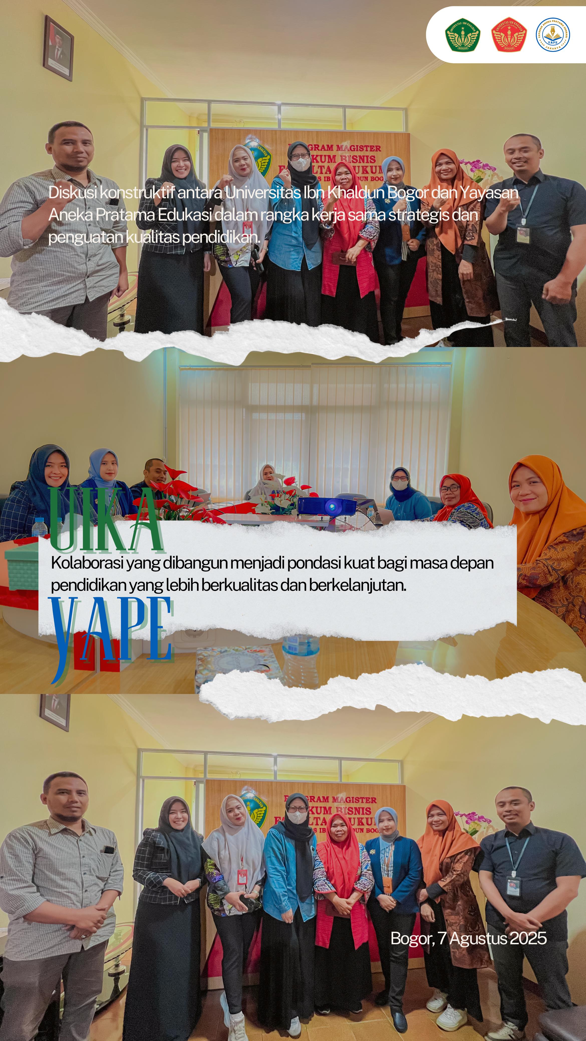 Bogor tanggal 7 Agustus 2025, Fakultas Hukum Universitas Ibn Khaldun (UIKA) Bogor menindaklanjuti Nota Kesepahaman (MoU) pada tanggal 10 Juli 2025 yang telah disepakati bersama Yayasan Aneka Pratama Edukasi (YAPE) melalui pertemuan lanjutan yang membahas secara rinci rancangan kurikulum dan aspek keuangan dalam pelaksanaan Program Studi Ilmu Hukum (S1) dan Magister Hukum Bisnis (S2).